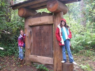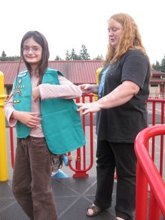 The same guy, Patrick, was there. He was very helpful and encouraging, since this was the first time for all of us (besides the kids on short, playground walls). Kyler went first, and like the monkey he is, made it up pretty well. Ilea followed, and also did very well. Her longer arms made it look a little easier even. Patrick held us (belay), and when you got to the top, you got to repel back down. The kids of course showed no fear. Then it was my turn. I'm not afraid of heights at all, and I knew it would be hard, but it was even harder than I thought. I thought I had OK upper arm strength, and I can do some pretty good bench presses for a girl, but this killed me. It was much slower going for me. People kept saying where to put my foot or arm, and I kept thinking, Are they crazy? I can't reach that! But slowly I did it, and even hit the Kitty goal at the top! Then he wanted me to let go to get down. That took some faith for me too! Coming down was fun, once
