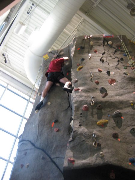 I let go of the rocks. Kipp did the first section easily, and looked great. The kids did another, and Kipp got a harder one to try next time. The kids kept taking their turns, and making it every time. Kipp did 4 or 5 climbs all together, and finally got too tired. I tried to do one more, but after an awkward reach with my foot I felt a tweak in the ankle I sprained a few weeks ago. I called it quits. Kipp's sore on his knuckles mostly, but pretty tired all over. The kids don't seem to be feeling it much at all. Everyone was able to go as much as they wanted. It was a really neat experience. What a great, safe environment. I still think people out on actual cliffs are nuts though!