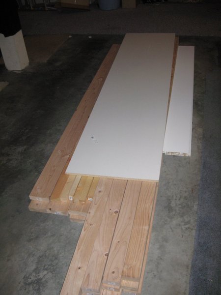 On Saturday, we bought plans for the bed, shelves, and desk and I went to Home Depot to pick out all of the wood and hardware. Even with a checklist for all of the things I needed, it took me about an hour and fifteen minutes. I was getting quite frustrated trying to locate a few things (what is masonite anyway?). In the end, I came home with $185 worth of supplies. It was getting pretty late so I ended up just stacking it under the car and called it a night.