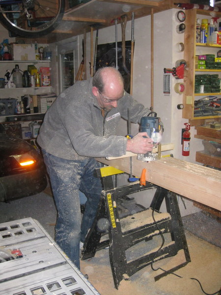 dado set, multiple single blade cuts or a drill to form the notches. None of those sounded like too much fun but we bought a router a few years back and don't routers allow you to cut notches? Yes, they do... So looking in our router bit set, that had never been opened, I tried to find the right bit to make the cut. I could have done it with a couple of the bits if all I was trying to do was make a 1" deep notch but it turns out that 2x4's are 1 1/2 inches deep so I had to make a second trip to Home Depot to purchase a 2" router bit and a few clamps. I got out of there $55 lighter. This was my first time using the router so it was a bit scary. I clamped all four 2x6 legs together and marked where the notches had to go. Then with the router (after reading the manual and a router book a few times) I started making the notches (4 of them). The first notch was took about as long as the other 3 combined, which is typical when I'm doing something new like this. Even though this wasn't the fastest option, it was pretty fun after I got the hang of using the router. In the end, I was covered with wood shavings but the job was done and it didn't look too bad.