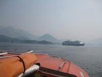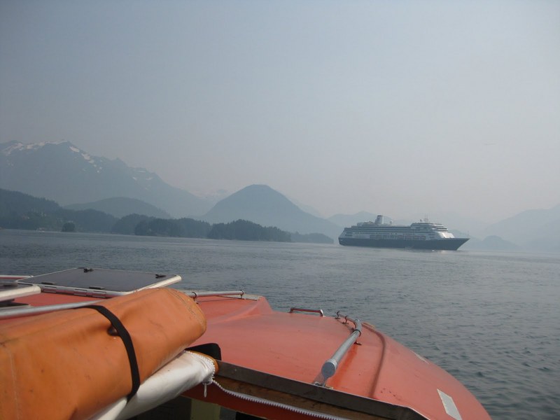 Our ship had the best dock! We got off the ship and were right at the bottom of the tram to Mt Roberts that we had decided to go on. The tram went up 1800 feet. Other ships (there were 2 ships on the same route as us, from Seattle), had to dock further away, and had quite a walk to get to the tram and shopping. This is our ship as we headed up the mountain. It was a little hazy that day because there were a lot of fires in the Yukon and Canada, and the smoke was drifting our way.