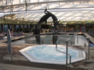 We did a little shopping at the bottom. Basically, all these towns have the same shops near the ships - art and jewelry shops mixed with tourist souvenirs. We did our fair share of getting souvenirs at every port, and enjoyed all the different art shops. There were all kinds are glass, wood, crafts, statues and paintings. It was fun, but we finally got tired, and went back to the ship. We relaxed for a while before dinner, and the kids swam again. Did I mention that there was a retractable roof over the pool (there were 2 pools, this is the one in the middle of the ship, with 2 hot tubs - the other was on the same deck, but out in back, and it could get pretty windy)? If it got too humid they would open it a bit. If it got too windy, they would close it some. They were really good about keeping it very pleasant, and the roof was made with glass windows, so it was bright and airy even when it was totally closed.