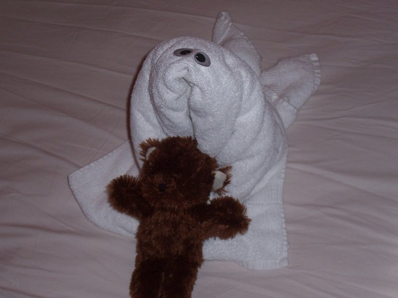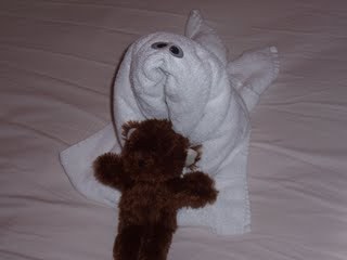 The cabin steward usually made up our room in the morning, and then came again in the evening. Every day there would be a "towel creature" on the main bed. The first one, on Day 2, was maybe a snake or something. We weren't really sure. This one was a seal, and he added Kyler's brown bear. It was fun to see what he would do every day.